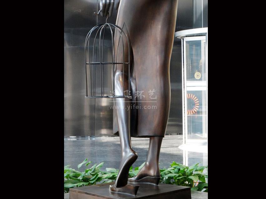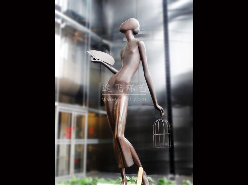 作品将平面油画中上世纪三四十年代上海女性形象翻成立体雕塑,刻画的是一位身姿窈窕、扭身顾盼的上海少女。盘发少女身材细高,身着无袖旗袍、坡跟尖头拖凉鞋,左手勾笼,右手持扇,极简的线条将上海少女特有的娇嗲时髦表现出来,大胆而准确。手中的鸟笼与香扇、顾盼生姿的神态,无不唤起人们对于老上海以及老上海女性的怀旧情结。